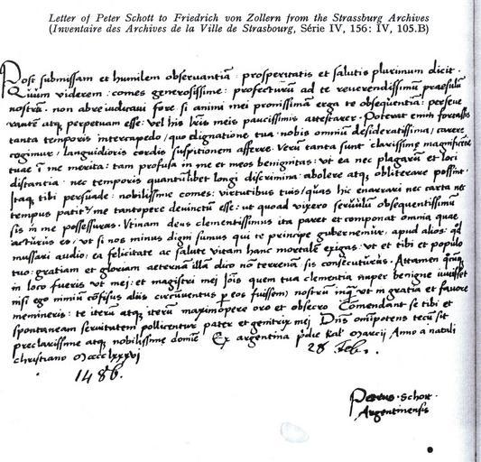 Keywords: Schott letter to zollern.jpg Lateinischer Brief autograph von Peter Schott dem Jüngeren an Bischof Friedrich von Zollern Straßburg 28 Februar 1486 Stadtarchiv Straßburg IV 105B The Works of Peter Schott 1460-1490 Hrsg von Murray A Cowie/Marian L Cowie Bd 2 Chapel Hill 1963 S 780 1486 Peter Schott the younger PD-old-100 Peter Schott the younger