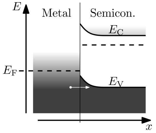 Keywords: Schottky barrier minority carrier injection.svg en wikipedia Schottky barrier under minority carrier injection conditions Schottky barrier is very high nearly as high as the band gap 2013-06-06 22 20 58 own Nanite Source code Made using Ipe Source code below also placed into public domain <source lang xml > < xml version 1 0 > < DOCTYPE ipe SYSTEM ipe dtd > <ipe version 70005 creator Ipe 7 1 2 > <info created D 20130511174826 modified D 20130606221857 /> <ipestyle name cust > <pen name heavier value 1 /> <arrowsize name large value 10 /> <arrowsize name small value 5 /> <arrowsize name tiny value 3 /> <color name gray value 0 5 /> <color name darkgray value 0 25 /> <color name lightgray value 0 75 /> <dashstyle name dashed value 4 0 /> <dashstyle name dotted value 1 0 /> <textsize name large value \large /> <textsize name small value \small /> <textsize name tiny value \tiny /> <textsize name Large value \Large /> <textsize name LARGE value \LARGE /> <textsize name huge value \huge /> <textsize name Huge value \Huge /> <textsize name footnote value \footnotesize /> <textstyle name center begin \begin center end \end center /> <textstyle name itemize begin \begin itemize end \end itemize /> <textstyle name item begin \begin itemize \item end \end itemize /> <gridsize name 4 pts value 4 /> <gridsize name 8 pts ~3 mm value 8 /> <gridsize name 16 pts ~6 mm value 16 /> <gridsize name 32 pts ~12 mm value 32 /> <gridsize name 10 pts ~3 5 mm value 10 /> <gridsize name 20 pts ~7 mm value 20 /> <gridsize name 14 pts ~5 mm value 14 /> <gridsize name 28 pts ~10 mm value 28 /> <gridsize name 56 pts ~20 mm value 56 /> <gridsize name 2 pts value 2 /> <anglesize name 90 deg value 90 /> <anglesize name 60 deg value 60 /> <anglesize name 45 deg value 45 /> <anglesize name 30 deg value 30 /> <anglesize name 22 5 deg value 22 5 /> <layout paper 132 112 origin 0 0 frame 132 112 /> <gradient name fermi type axial coords 0 36 0 68 extend yes > <stop offset 0 color 0 25 /> <stop offset 1 color 1 /> </gradient> <gradient name fermisem type axial coords 0 58 0 90 extend yes > <stop offset 0 color 0 25 /> <stop offset 1 color 1 /> </gradient> <tiling name falling angle -60 step 4 width 1 /> <tiling name rising angle 30 step 4 width 1 /> </ipestyle> <page> <layer name alpha /> <layer name BBOX /> <view layers alpha active alpha /> <path layer alpha fill white gradient fermisem > 124 16 m 68 16 l 68 48 l 76 38 92 38 s 124 38 l </path> <path fill white gradient fermisem > 124 108 m 68 108 l 68 92 l 76 82 92 82 s 124 82 l </path> <path fill white gradient fermi > 68 108 m 68 16 l 28 16 l 28 108 l h </path> <path matrix 1 0 0 1 0 -20 stroke black dash dashed pen heavier > 16 72 m 68 72 l </path> <text matrix 1 0 0 1 -150 -686 464 transformations translations pos 152 736 stroke black type label width 12 993 height 6 812 depth 1 49 valign baseline > E_ \rm F </text> <path layer BBOX stroke black > 0 0 m 0 112 l 132 112 l 132 0 l h </path> <path layer alpha matrix 1 0 0 1 2 -8 stroke black pen heavier rarrow normal/normal > 20 116 m 20 24 l </path> <text matrix 1 0 0 1 -134 -632 464 transformations translations pos 152 736 stroke black type label width 7 929 height 6 808 depth 0 halign right valign baseline > E </text> <path matrix 1 0 0 1 0 -2 stroke black pen heavier arrow normal/normal > 32 12 m 128 12 l </path> <text matrix 1 0 0 1 44 -12 transformations translations pos 80 14 stroke black type label width 5 694 height 4 289 depth 0 valign baseline > x </text> <text matrix 1 0 0 1 20 -12 transformations translations pos 28 110 stroke black type label width 25 183 height 6 918 depth 0 halign center valign baseline >Metal</text> <text matrix 1 0 0 1 -70 -6 transformations translations pos 162 90 stroke black type label width 13 54 height 6 812 depth 1 49 valign baseline > E_ \rm C </text> <text matrix 1 0 0 1 -70 -50 transformations translations pos 162 90 stroke black type label width 13 84 height 6 812 depth 1 49 valign baseline > E_ \rm V </text> <text matrix 1 0 0 1 68 -12 transformations translations pos 28 110 stroke black type label width 38 744 height 6 808 depth 0 halign center valign baseline >Semicon </text> <path matrix 1 0 0 1 0 4 stroke black pen heavier > 68 88 m 76 78 92 78 s 124 78 l </path> <path matrix 1 0 0 1 0 4 stroke black pen heavier > 68 44 m 76 34 92 34 s 124 34 l </path> <path matrix 1 0 0 1 0 4 stroke black dash dashed pen heavier > 70 70 m 124 70 l </path> <path matrix 1 0 0 1 0 -47 stroke white rarrow normal/tiny > 76 85 m 59 85 l </path> <path matrix 1 0 0 1 -17 -46 fill white > 1 0 0 1 77 84 e </path> <path stroke black > 68 110 m 68 8 l </path> </page> </ipe> </source> cc-zero Uploaded with UploadWizard Metal-semiconductor junction band diagrams |