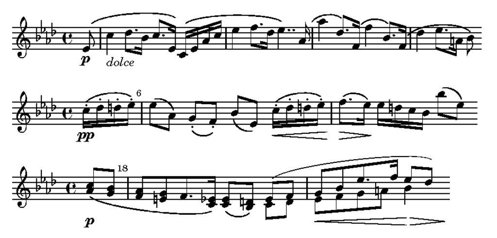 | Keywords: Schumann-3m3-themes.png Themes of the third movement in Schumann's symphony no 3 bars 1 ff 6ff 18ff Own 2007-06-13 Thomas Schultz music by Robert Schumann who died more than 70 years ago; engraving is own work and hereby released into the public domain musical notation LilyPond source \version 2 10 13 \include deutsch ly \layout indent 0 line-width 150 ragged-last t << \relative \new Staff \time 4/4 \key as \major \clef treble \partial 8 es8\p\ c'4_\markup \italic dolce des8 b16 c8 es 16\ c16 \ es as c es4 f8 des16 es4 \ as 16\ as'4 des 8 \ f 16\ f'4 b 8 \ f16\ des'4 es8 a 16 b8\ >> << \set Score currentBarNumber 6 \relative \new Staff \time 4/4 \key as \major \partial 4 c'16- \pp\ des- d- es- \ \once\override Score BarNumber 'break-visibility end-of-line-invisible es8\ as \ g- \ f- \ b\ es \ c'16- \ \< des- d- es- \ f8 \ \> es16\ \ es16 d c b b'8\ es \ >> << \set Score currentBarNumber 18 \relative \new Staff \time 4/4 \key as \major \bar \set Staff printPartCombineTexts f \partial 4 \partcombine \relative c'8\p\ b \once\override Score BarNumber 'break-visibility end-of-line-invisible as g f8 es16\ es8\ d\ es f g b es8 f16 es8 des \relative as'8\ g f e f8 c16\ c8\ b\ c d es\< f g a b4\> s8\ >> Sheet music of Robert Schumann |