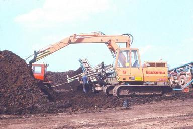 Keywords: Schwarztorfverladung.jpg de Schwarztorfverladung im BT Breesen self-photographed Dr Günter Pinzke 1987 Cc-zero Peat cutting in Germany Roggendorf Mecklenburg Peat cutting machines Excavators