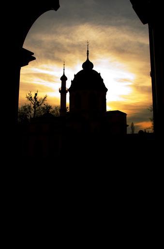 Keywords: schwetzingen schlossgarten castle romantic evening beautiful twilight germany melancholic sunset mosque minaret november silhouette sun orange yellow