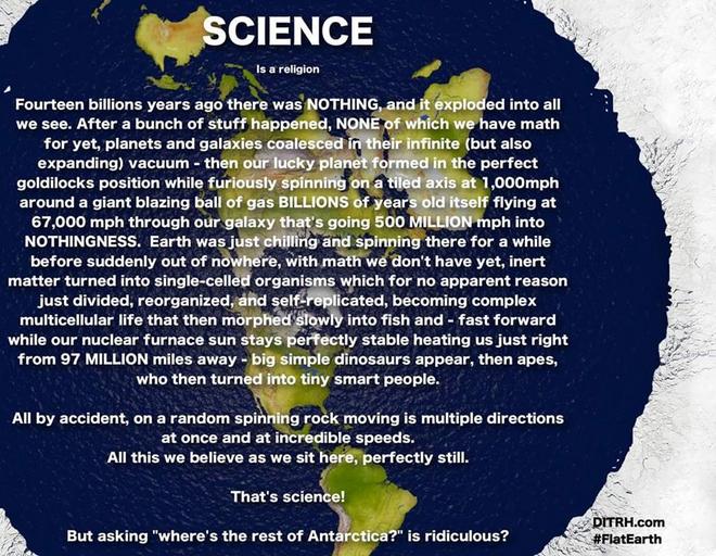 | Keywords: ditrh billions science ditrhbillionsscience nothing vacuum planet mph nuclear complex apes fish dinosaurs religion flatearth memes flat dome firmament yinyang bible truth flatearth.online sun moon curve curvature nocurve nothingvacuumplanetmphnuclearcomplexapesfishdinosaursreligionflatearthmemesflatdomefirmamentyinyangbibletruthflatearthonlinesunmooncurvecurvaturenocurve text Science is a religion. Fourteen billions years ago there was nothing, and it exploded into all we see. After a bunch of stuff happened, none of which we have math for yet, planets and galaxies coalesced in their infinite (but also expanding) vacuum - then our lucky planet formed in the perfect goldilocks position while furiously spinning on a tilted axis at 1,000mph around a giant blazing ball of gas billions of years old itself flying at 67,000mph through out galaxy that's going 500 million mph into nothingness. Earth was just chilling and spinning there for a while before suddenly out of nowhere, with math we don't have yet, inert matter turned into single-celled organisms which for no apparent reason just divided, reorganized, and self-replicated, becoming complex melticellular life that then morphed slowly into fish and - fast forward while our nuclear furnace sun stays perfectly stable heating us just right from 97 million miles away - big simple dinosaurs appear, then apes, who then turned into tiny smart people. All by accident, on random spinning rock moving in multiple directions at once and at incredible speeds. All this we believe as we sit here, perfectly still. That's science! But asking Where's the rest of Antarctica is ridiculous? FlatEarth meme collected by A.J. Wilson of iPressThis at FlatEarth.Online, made by others. Credit to DITRH.com #FlatEarth Science is a religion. Fourteen billions years ago there was nothing, and it exploded into all we see. After a bunch of stuff happened, none of which we have math for yet, planets and galaxies coalesced in their infinite (but also expanding) vacuum - then our lucky planet formed in the perfect goldilocks position while furiously spinning on a tilted axis at 1,000mph around a giant blazing ball of gas billions of years old itself flying at 67,000mph through out galaxy that's going 500 million mph into nothingness. Earth was just chilling and spinning there for a while before suddenly out of nowhere, with math we don't have yet, inert matter turned into single-celled organisms which for no apparent reason just divided, reorganized, and self-replicated, becoming complex melticellular life that then morphed slowly into fish and - fast forward while our nuclear furnace sun stays perfectly stable heating us just right from 97 million miles away - big simple dinosaurs appear, then apes, who then turned into tiny smart people. All by accident, on random spinning rock moving in multiple directions at once and at incredible speeds. All this we believe as we sit here, perfectly still. That's science! But asking Where's the rest of Antarctica is ridiculous? FlatEarth meme collected by A.J. Wilson of iPressThis at FlatEarth.Online, made by others. Credit to DITRH.com #FlatEarth |