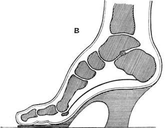 Keywords: Science ofDressTo face p236cutB.png The bones of the foot at rest B Distorted position caused by high heel Science of Dress to face of page 236 1885 Ada S Ballin PD Image Science_ofDressTo_face_p236 png PD-old Science of Dress Language-neutral diagrams Anatomy of the human foot High-heeled shoes Shoes