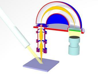 Keywords: Scienta5.jpg Created with Persistence of Vision en revisited work of File PES1 jpg with better light smoother electron path and less shadows Own Saiht 2009-06-15 POVray script <pre> // Schnitt durch ein PhotoelectronSpetroskopie Experiment // by Matthias Kreier version 0 8; global_settings assumed_gamma 1 0 default finish ambient 0 6 diffuse 0 4 include colors inc include textures inc camera ultra_wide_angle angle 25 location <35 30 -65> look_at <3 10 0> //plane <0 1 0> -1 pigment color Red //plane <0 0 -1> -50 pigment color White plane <0 1 -1> -2000 pigment color LightGray // Linsensystem zur Fokussierung und Retardierung declare Linsensystem union difference union box <-2 1 3 0 -2 1> <2 1 3 2 2 1> box <-2 1 3 4 -2 1> <2 1 3 6 2 1> box <-2 1 3 8 -2 1> <2 1 4 0 2 1> box <-2 1 6 8 -2 1> <2 1 7 0 2 1> pigment color Blue cylinder < 0 2 9 0 > <0 7 1 0> 0 81 pigment color Silver cylinder < 0 2 9 0 > <0 7 1 0> 2 pigment color Silver inverse difference union cylinder < 0 4 2 0 > <0 4 4 0> 2 1 cylinder < 0 4 3 0 > <0 6 5 0> 1 4 cylinder < 0 6 4 0 > <0 6 6 0> 2 1 cylinder < 0 7 2 0 > <0 7 4 0> 2 1 cylinder < 0 7 3 0 > <0 9 9 0> 1 4 cylinder < 0 9 8 0 > <0 10 0> 2 1 cylinder < 0 10 2 0 > <0 10 4 0> 2 1 cylinder < 0 10 3 0 > <0 11 2 0> 1 4 cylinder < 0 4 1 0 > <0 11 0> 1 2 pigment color Silver cylinder < 0 10 9 0 > <0 11 3 0> 0 8 pigment color Silver cylinder < 0 4 1 0 > <0 11 3 0> 2 pigment color Silver inverse translate <0 1 0> declare Kugelanalysator union intersection // innere Kugel difference sphere <6 14 0> 4 2 texture Polished_Chrome sphere <6 14 0> 4 pigment color Blue box <1 14 -1> <11 19 5> pigment color Red intersection // äußere Kugel difference sphere <6 14 0> 8 pigment color Blue sphere <6 14 0> 7 8 pigment color Silver box <-3 14 -1> <15 23 9> pigment color Red difference // Herzog-Platte cylinder < 6 12 5 0 > < 6 13 0 > 9 pigment color LightSteelBlue cylinder < 0 12 4 0> <0 13 1 0> 1 1 pigment color Silver cylinder < 12 12 4 0> <12 13 1 0> 2 3 difference cylinder < 12 12 5 0 > < 12 13 8 0 > 2 4 pigment color Blue cylinder < 12 12 4 0> < 12 13 9 0> 2 2 pigment color Silver intersection // Eingangsspalte union box <-2 13 25 -2> <2 13 35 2> pigment color Blue box <-0 6 13 3 -2> <0 6 13 75 2> pigment color Blue box <-0 2 13 2 -2 1> <0 2 14 1 2 1> pigment color Silver inverse intersection // Eingangsblenden union cylinder < 0 13 85 0 > < 0 13 9 0 > 2 pigment color Blue cylinder < 0 13 1 0 > < 0 13 15 0 > 2 pigment color Blue box <-0 15 13 0 -1> <0 15 14 1 1> pigment color Silver inverse declare Optik union object Linsensystem pigment color Blue object Kugelanalysator rotate<0 0 0> declare Scienta union intersection // Linsensystem und Analysator entlang x aufgeschnitten object Optik box <-3 2 0> <15 23 9> pigment color Red intersection //aufgeschnitten union cylinder <12 13 3 0> <12 13 8 0> 2 pigment color CadetBlue // Channelplate cylinder <12 13 0 0> <12 13 2 0> 2 pigment color Green // Phosphorplatte box <9 10 0> <15 15 9> pigment color rgbf <1 1 1 1> difference // CCD Kamera cylinder <12 9 5 0> <12 11 0> 1 8 pigment color CadetBlue cylinder <12 10 0> <12 11 1 0> 1 6 pigment color Black cylinder <12 9 6 0> <12 8 0> 1 4 pigment color CadetBlue cylinder <12 8 1 0> <12 5 5 0> 1 8 pigment color CadetBlue cone <12 11 0> 1 6 <12 12 95 0> 2 texture pigment rgbf<1 1 0 7 0 97> // Weg der Elektronen declare Elektron1 union intersection // Normales Elektron Passenergie intersection torus 6 0 5 rotate<-3 8 0 0> translate <0 0 46 0> torus 6 0 5 rotate< 3 8 0 0> translate <0 -0 46 0> torus 6 0 7 translate <-0 67 0 0> torus 6 0 7 translate < 0 67 0 0> rotate<90 0 0> translate<6 14 0> box <-2 14 -2> <13 23 2> / intersection // Energie kleiner als Epass intersection torus 6 0 5 rotate<-3 8 0 0> translate <0 0 46 0> torus 6 0 5 rotate< 3 8 0 0> translate <0 -0 46 0> torus 6 0 7 translate <-0 67 0 0> torus 6 0 7 translate < 0 67 0 0> rotate<90 0 0> scale 0 9 translate<5 4 14 0> box <-2 14 -2> <13 23 2> intersection // Energie größer als Epass intersection torus 6 0 5 rotate<-3 8 0 0> translate <0 0 46 0> torus 6 0 5 rotate< 3 8 0 0> translate <0 -0 46 0> torus 6 0 7 translate <-0 67 0 0> torus 6 0 7 translate < 0 67 0 0> rotate<90 0 0> scale 1 1 translate<6 6 14 0> box <-2 14 -2> <15 23 2> / cone < 0 0 0 > 0 <0 5 5 0> 0 5 cone < 0 5 5 0 > 0 5 <0 6 0 0> 0 57 cone < 0 6 0 0 > 0 57 <0 6 4 0> 0 57 cone < 0 6 4 0 > 0 57 <0 7 0> 0 45 cone < 0 7 0 > 0 45 <0 8 2 0> 0 03 cone < 0 8 0 > 0 03 <0 9 0> 0 5 cone < 0 9 0 > 0 5 <0 10 0> 0 6 cone < 0 10 0 > 0 6 <0 11 0> 0 5 cone < 0 11 0 > 0 5 <0 13 5> 0 02 cone < 0 13 5 0> 0 02 <0 14 0> 0 05 // cone < 0 11 0 > 0 2 <0 14 1 0> 0 05 // cylinder < 0 5 0 > <0 11 0> 0 2 // cone < 0 0 0 > 0 <0 5 0> 0 2 declare Lichtquelle union cylinder <-18 18 0> <1 -1 0> 0 5 texture pigment rgbf<1 1 0 6 0 7> difference cylinder <-5 5 5 5 0> <-40 40 0> 1 2 cylinder <-5 4 5 4 0> <-20 20 0> 0 5 pigment color LightBlue declare Sample union box <-4 8 -0 5 -4 8> <4 8 0 4 8> pigment color RichBlue cylinder < 0 -1 0 > < 0 -2 0> 1 pigment color Green // alles zusammenbauen object Scienta object Elektron1 pigment color Orange object Lichtquelle object Sample // Lichtquellen light_source <12 18 -200> color White light_source // <0 26 -20> <35 30 -65> color White light_source // Rückseite beleuchten <20 30 10> color White / light_source <-60 28 -200> color White light_source // <0 26 -20> // <30 30 -45> <20 30 -65> color White light_source <20 30 10> color White // Rückseite beleuchten light_source // Kugel innen Licht <9 21 1 5> color White / </pre> Photoemission spectroscopy |