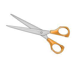 Keywords: scissors sharp tool cutting grooming instrument barber hair salon equipments two blades slightly open steel orange handles metallic