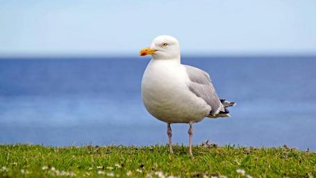 Keywords: scotland st andrews seagull sit sky clouds meadow grass sea coast