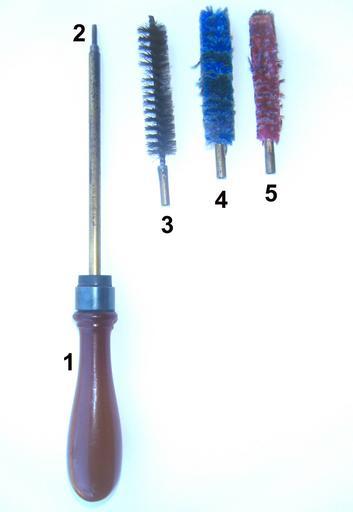 Keywords: Scovoli.jpg en Gun-barrel brush 1 handle; 2 screw; 3 brush for cleaning; 4 and 5 Brushes for cleaning and lubricate the barrel it Scovoli per canne di armi 1 manico; 2 vite di fissaggio per gli scovoli; 3 scovolo per pulire; 4 e scovoli per oliare la canna own Ricce Brushes |