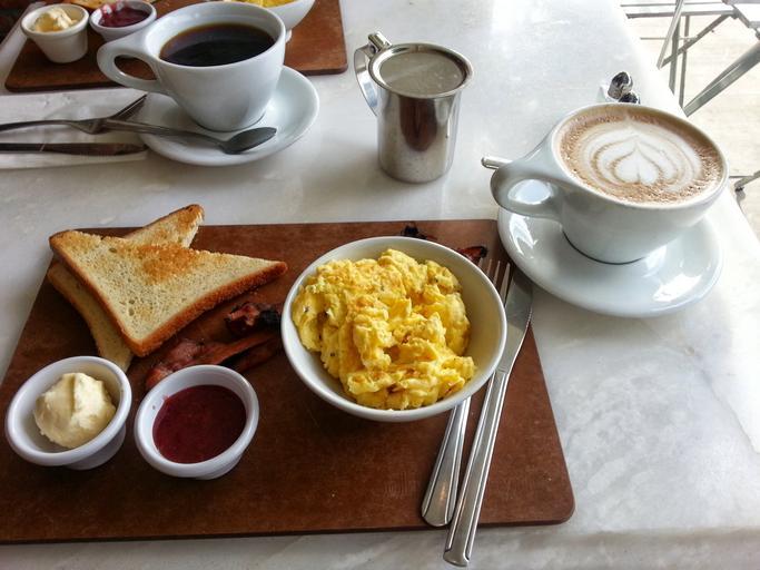 Keywords: scrambled eggs breakfast coffee latte eggs toast brunch meal morning