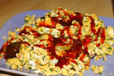 Keywords: scrambled eggs ketshup eat food lunch benefit from meal delicious