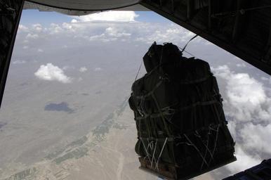 | Keywords: Screamer 2K, Joint Precision Air Drop System DVIDS29499.jpg en OVER AFGHANISTAN - The new GPS guided Screamer 2K bundle Joint Precision Air Drop System fall out of the back of a C-130 Hercules over Afghanistan Aug 26 2006 The drop was made from 17 500 feet above mean sea level and was the first joint Air Force/Army operational drop of JPADS in the Central Command Area of Responsibility Four bundles were dropped from the Alaska Air National Guard C-130 The system is designed to provide precision airdrops from high altitudes elimination the treat of small arms fire All four bundles arrived at the drop zone re-supplying Army troops on the ground with ammunition and water U S Air Force photo/Senior Airman Brian Ferguson 2006-08-26 https //www dvidshub net/image/29499 29499 2006-09-08 13 25 AF PD-USGov Lockheed C-130 Hercules Images from DoD uploaded by Fæ |