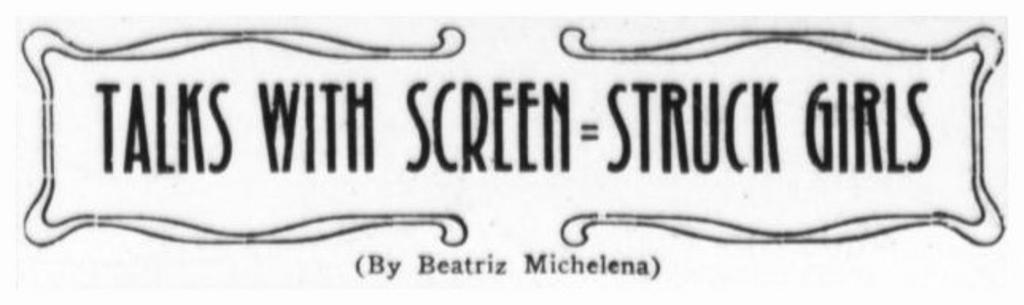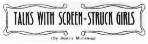 Keywords: ScreenStruckGirls.jpg en Newspaper masthead of silent film actress Beatriz Michelena appearing at the top of her regular advice column entitled Talks with Screen-struck Girls This image appeared May 14 1916 in the Prescott Miner-Dealer an Arizona newspaper http //news google com/newspapers id -XQNAAAAIBAJ sjid wFADAAAAIBAJ pg 5594 443377 dq beatriz+michelena hl en Author 1916-05-14 public domain unknown PD-old Check categories 2010 April 14 en wikipedia Beatriz_Michelena 1 Beatriz Michelena |
