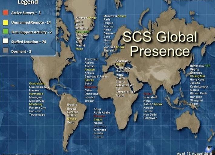| Keywords: SCSGlobalPresence.png en Location and status of CIA/NSA Special Collection Service SCS eavesdropping sites as of 13 August 2010 2010-08-13 http //cryptome org/2013/10/nsa-cia-berlin-spy-nest pdf Director National Intelligence SIGINT Development Released by German newspaper Der Spiegel s of the some locations in 2004 fourth column which are italicized are based on deduction - some are only partially redacted and can be recognized from lower portions of letters and others fit neatly into an alphabetical sequence Among those described as presumed absent up to five may have been present on the 2004 lists of survey sites and future survey sites Additionally a redacted entry between Rome and San Jose appears to have been removed wikitable sortable City Region Type Status in 2004 - Guadalajara Central America unmanned remote present - Guatemala City Central America staffed present - Havana Central America staffed present - Hermosillo Central America unmanned remote presumed absent - Managua Central America staffed present - Mexico City Central America staffed present - Monterrey Central America unmanned remote presumed absent - Panama City Central America staffed present - Port-au-Prince Central America absent from this list present - San Jose Central America staffed present - Tegucigalpa Central America staffed present - Brasilia South America staffed present - Bogota South America staffed present - Caracas South America staffed present - La Paz South America staffed survey site - Merida South America staffed - Quito South America staffed survey site - Athens Europe staffed unmanned remote annex present - Baku Europe staffed presumed redacted - Berlin Europe staffed presumed absent - Budapest Europe staffed present - Croughton Europe tech support activity technical support RESC - Frankfurt Europe staffed present - Geneva Europe staffed present - Kiev Europe staffed - Madrid Europe staffed present - Milan Europe unmanned remote future survey site - Moscow Europe staffed unmanned remote annex presumed redacted - Paris Europe staffed present - Prague Europe staffed present - Pristina Europe staffed presumed redacted - Rome Europe staffed present - Sarajevo Europe staffed present - Skopje Europe absent from this list future survey site - Sofia Europe staffed present - Tbilisi Europe staffed present - Tirana Europe dormant present - Vienna Europe staffed unmanned remote annex present - Zagreb Europe staffed present - Abu Dhabi Middle East staffed - Algiers Middle East staffed - Amman Middle East staffed partially redacted - Amarah Middle East unmanned remote - Ankara Middle East staffed present - Baghdad Middle East staffed staffed annex presumed redacted - Basrah Middle East unmanned remote presumed redacted - Beirut Middle East staffed presumed absent - Belgrade Middle East active survey presumed absent - Cairo Middle East staffed presumed redacted - Damascus Middle East staffed - Istanbul Middle East staffed present - Jeddah Middle East staffed - Khartoum Middle East staffed - Kirkuk Middle East unmanned remote - Kuwait City Middle East staffed presumed redacted - Manama Middle East staffed presumed redacted - Mosul Middle East staffed presumed redacted - Riyadh Middle East staffed partially redacted - Sana'a Middle East staffed - Sulaymaniyah Middle East staffed - Tello Middle East staffed - Tehran in Exile Middle East staffed - Tripoli Middle East staffed - Abuja Africa staffed - Addis Ababa Africa staffed - Bamako Africa active survey presumed absent - Lagos Africa unmanned present - Nairobi Africa staffed presumed redacted - Monrovia Africa dormant present - Kinshasa Africa staffed - Lukasa Africa staffed presumed redacted - Luanda Africa dormant presumed redacted - Dhaka South Asia active survey - Dushanbe South Asia absent from this list future survey site - Islamabad South Asia staffed presumed redacted - Herat South Asia staffed presumed absent - Kabul South Asia staffed unmanned annex - Karachi South Asia staffed - Lahore South Asia staffed presumed redacted - New Delhi South Asia staffed present - Peshawar South Asia staffed presumed redacted - Tashkent South Asia absent from this list future survey site - Bangkok East Asia/Oceania staffed tech support activity PSA present PSA presumed redacted - Beijing East Asia/Oceania staffed partially redacted - Chengdu East Asia/Oceania staffed - Chiang Mai East Asia/Oceania unmanned annex - Hong Kong East Asia/Oceania staffed partially redacted - Jakarta East Asia/Oceania staffed - Kuala Lampur East Asia/Oceania staffed present - Manila East Asia/Oceania staffed present - Phnom Penh East Asia/Oceania staffed presumed redacted - Rangoon East Asia/Oceania staffed present - Shanghai East Asia/Oceania staffed present - Taipei East Asia/Oceania staffed partially redacted |