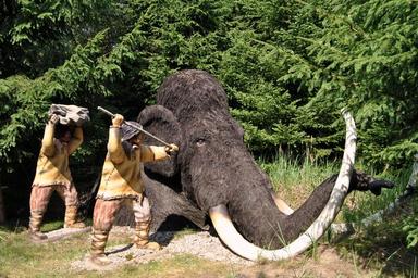 Keywords: sculpture animal sculpture woolly urzeittier landscape park firs trees primeval park theme park oranienburg hunting scene