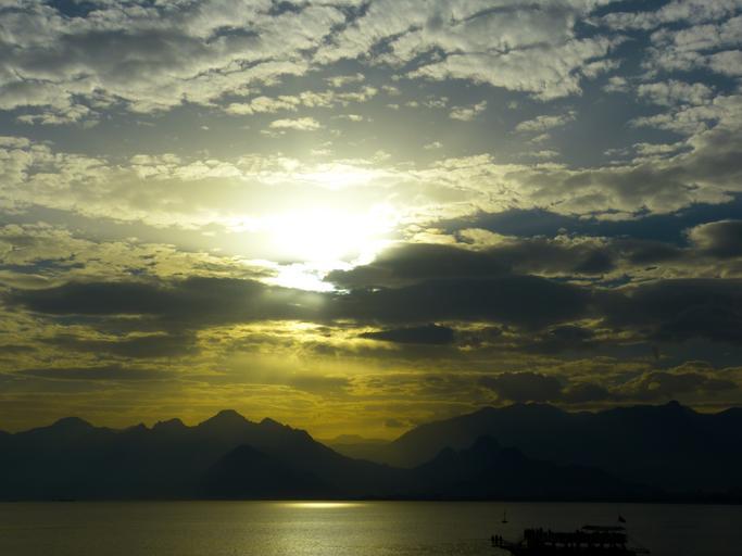 Keywords: sea abendstimmung horizon mountains sunset clouds sky mediterranean back light silhouette shadow