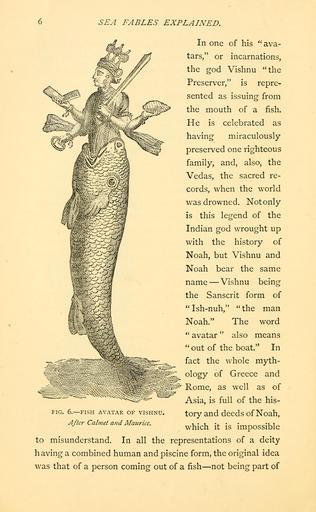 Keywords: Sea fables explained (14967407043).jpg SEA FABLES EXPLAINED <br> In one of his ava- <br> tars or incarnations <br> the god Vishnu the <br> Preserver is repre- <br> sented as issuing from <br> the mouth of a fish <br> He is celebrated as <br> having miraculously <br> preserved one righteous <br> family and also the <br> Vedas the sacred re- <br> cords when the world <br> was drowned Not only <br> is this legend of the <br> Indian god wrought up <br> with the history of <br> Noah but Vishnu and <br> Noah bear the same <br> name ” Vishnu being <br> the Sanscrit form of <br> Ish-nuh the man <br> Noah The word <br> avatar also means <br> out of the boat In <br> fact the whole myth- <br> i ology of Greece and <br> i Rome as well as of <br> Asia is full of the his- <br> tory and deeds of Noah <br> which it is impossible <br> to misunderstand In all the representations of a deity <br> having a combined human and piscine form the original idea <br> was that of a person coming out of a fish ” not being part of <br> FIG 6 ” FISH AVATAR OF VISHNU <br> After Calmet and Maurice 10985633 41337 10456 Page 6 Text http //www biodiversitylibrary org/page/10985633 1883 10 5962/bhl title 10456 International Fisheries Exhibition; Lee Henry Biodiversity Heritage Library Sea fables explained Mermaids Monsters Are Real Folklore Ocean Smithsonian Libraries bhl page 10985633 dc identifier http //biodiversitylibrary org/page/10985633 bhlMonstersRreal Halloween mermaid smithsonian libraries bhlmonstersrreal halloween Information field Flickr posted date ISOdate 2014-10-21 CC-BY-2 0 BioDivLibrary https //flickr com/photos/61021753 N02/14967407043 2015-08-25 17 58 19 cc-by-2 0 PD-old-70-1923 Sea fables explained Photos uploaded from Flickr by Fæ using a script |
