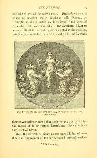 Keywords: Sea fables explained (15401561997).jpg THE MERMAID 9 <br> but all the rest of the body a fish's And this very same <br> image at Ascalon which Diodorus calls Derceto or <br> Atergatis is denominated by Herodotus the celestial <br> Aphrodite who was identical with the Cyprian and Roman <br> Venus Of all the sacred buildings erected to the goddess <br> this temple was by far the most ancient ; and the Cyprians <br> FIG 8 ” VENUS RISING FROM THE SEA SUPPORTED BY TRITONS <br> After Calvict <br> themselves acknowledged that their temple was built after <br> the model of it by certain Phoenicians who came from <br> that part of Syria <br> Thus the worship of Noah as the second father of man- <br> kind the repopulator of the earth passed through various <br> Lib i cap cv 10985630 41337 10456 Page 9 Text http //www biodiversitylibrary org/page/10985630 1883 10 5962/bhl title 10456 International Fisheries Exhibition; Lee Henry NameFound Atergatis NameConfirmed Atergatis EOLID 102128 NameBankID 530454 NameFound Diodorus NameFound Herodotus Biodiversity Heritage Library Sea fables explained Mermaids Monsters Are Real Folklore Ocean Smithsonian Libraries bhl page 10985630 dc identifier http //biodiversitylibrary org/page/10985630 bhlMonstersRreal Halloween mermaid smithsonian libraries bhlmonstersrreal halloween Information field Flickr posted date ISOdate 2014-10-21 CC-BY-2 0 BioDivLibrary https //flickr com/photos/61021753 N02/15401561997 2015-08-25 17 58 15 cc-by-2 0 PD-old-70-1923 Sea fables explained Photos uploaded from Flickr by Fæ using a script |