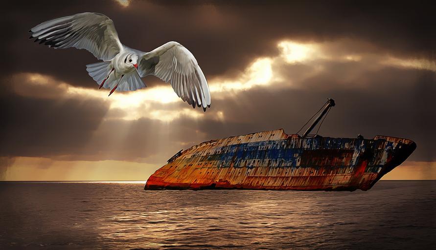 Keywords: sea lake water landscape seagull bird ship frachtschiff frack boat tails sky clouds sun sunset lighting painting digital art composing digital painting