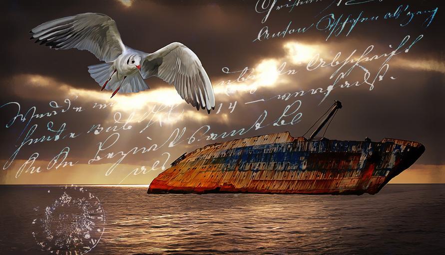 Keywords: sea lake water sky clouds sunset lighting ship merchant ship frack boat tails seagull bird font handwriting painting digital art digital painting composing greeting card