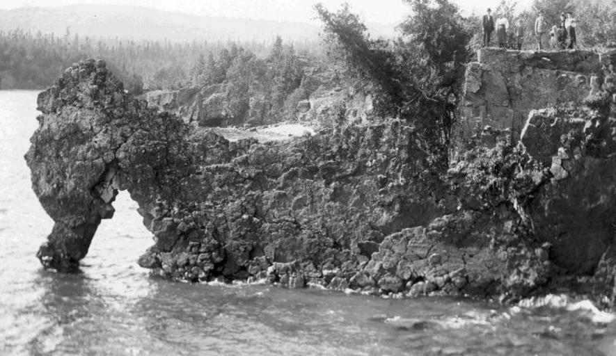 | Keywords: sea lion sealion nature rock formation rockformation erosion thunder bay thunderbay summer tourism recreation hiking fort william fortwilliam silver islet silverislet sleeping giant sleepinggiant ontario canada history blackandwhite monochrome outdoor black and white Date: c. 1905 Description: The sea lion, at the foot of the Sleeping Giant, was a popular tourist landmark for many decades. If you look carefully, you can see outlined in its rocks the profile of a lion – its mane, nose, mouth and forelimbs very evident. Unfortunately, a major spring storm that flung ice upon the formation in the 1930s left it unrecognizable. Photo by J.F. Cooke Accession No.: 974.106.10 Date: c. 1905 Description: The sea lion, at the foot of the Sleeping Giant, was a popular tourist landmark for many decades. If you look carefully, you can see outlined in its rocks the profile of a lion – its mane, nose, mouth and forelimbs very evident. Unfortunately, a major spring storm that flung ice upon the formation in the 1930s left it unrecognizable. Photo by J.F. Cooke Accession No.: 974.106.10 |