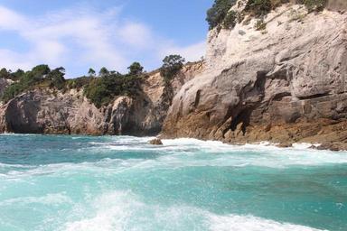 Keywords: sea new zealand whitianga coast nature rocky coast turquoise wave wilderness water stones sky summer holiday old stone dramatic tourism rocky landscape boat tour pacific north island pacific ocean