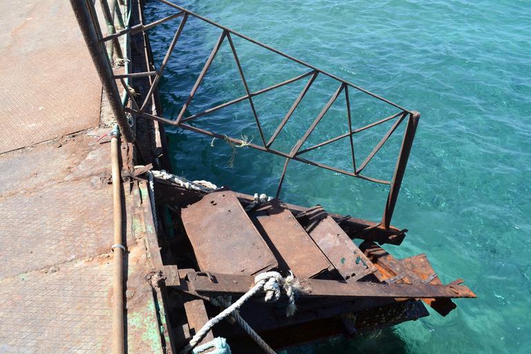 Keywords: sea pier stairs rust metal broken dangerous water blue iron