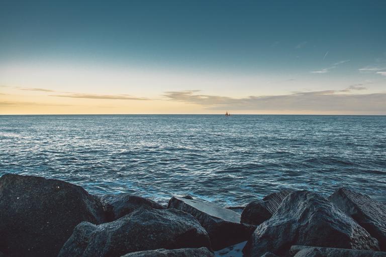 Keywords: sea shore rock nature horizon boat ocean sky cloudy morning early calm quiet alone lone