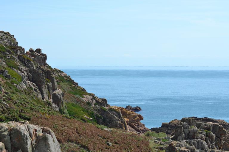 Keywords: sea view jersey rocks rock pools coastline blue sky afternoon hazy sun hot day blue see distant horizon rock flora channel islands