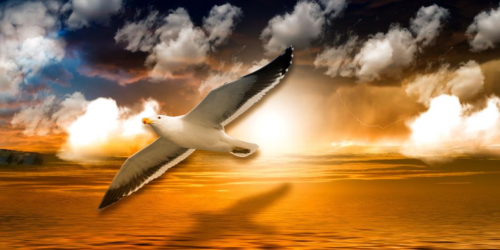 Keywords: seagull clouds sea nature lake flight fly sun water sky animal bird mood
