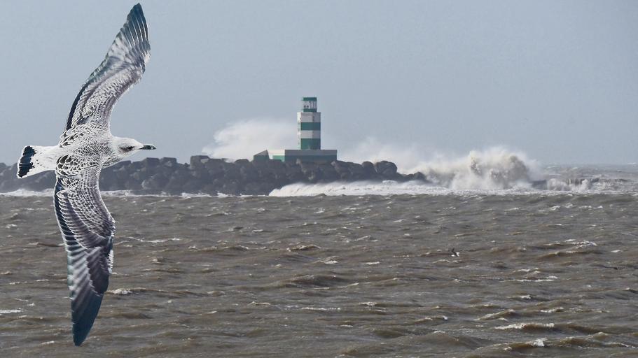 Keywords: seagull storm sea flight wings coast waves lighthouse