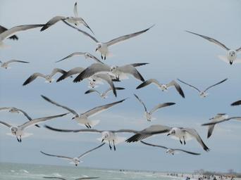 Keywords: seagulls birds flying blue sky grey gray white wings feathers plumage flight group water birds migration migrating traveling nature scenery scenic