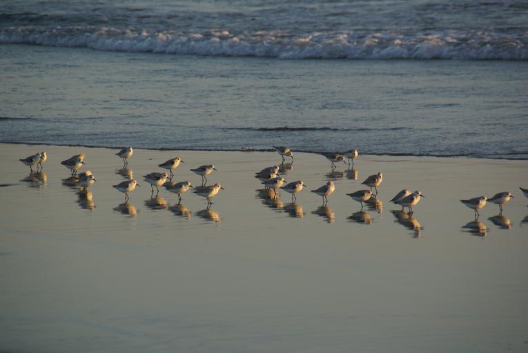 Keywords: seagulls gulls shore birds beach reflection flock