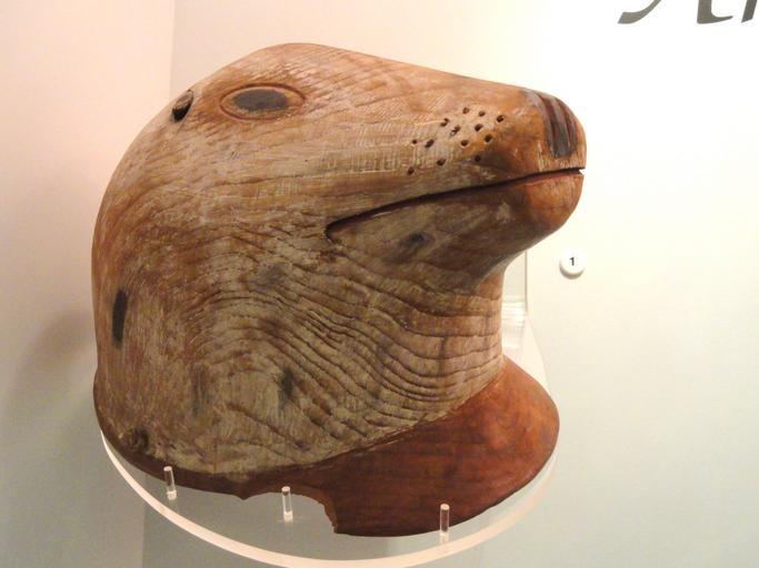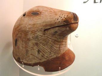 Keywords: Seal decoy helmet, Pacific Eskimo, Kodiak Island, before 1869 - Native American collection - Peabody Museum, Harvard University - DSC05643.JPG Seal decoy helmet Alutiiq Kodiak Island before 1869 Exhibit from the Native American Collection Peabody Museum Harvard University Cambridge Massachusetts USA Photography was permitted without restriction; exhibit is old enough so that it is in the public domain Daderot 2012-03-18 14 11 42 Daderot cc0 cc0 Native American Collection Peabody Museum Harvard University Alutiiq Sculptures in Alaska Native American woodcarving Seal hunting Hunting decoys Helmet masks Carved wooden figurines Pinnipedia heads Unidentified Phocidae |