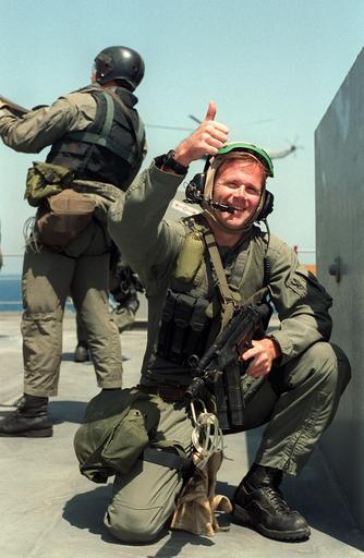 Keywords: SEAL MP5N.JPEG A member of Sea-Air-Land SEAL Team 8 armed with a 9mm MP-5A5E submachine gun gives a thumbs-up at the successful completion of a training mission aboard the USNS JOSHUA HUMPHREYS T-AO-188 SEAL Team 8 is providing boarding teams to assist the ships of the Maritime Interception Force in their enforcement of U N sanctions against Iraq during Operation Desert Storm USN 1991-02-01 PH2 USNR-R MILTON SAVAGE PD-USGov-Military-Navy Military people in 1991 HK MP5 Visit Board Search and Seizure United States Navy SEALs USNS Joshua Humphreys T-AO-188 Military people with thumbs up 1991 photographs Kneeling men Male soldiers SEAL Team 8