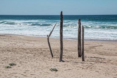 Keywords: seaside beach alone isolated lonely driftwood mystery sea ocean vacation summer sand coast summer beach leisure holiday beach sand seashore outdoors coastline shore structure wooden post pole weathered hot sunny peaceful quiet serene