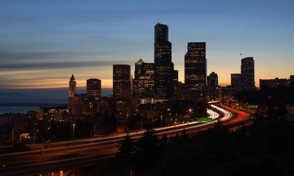 Keywords: seattle washington city cities night evening lights skyscrapers buildings downtown beautiful traffic road skyline