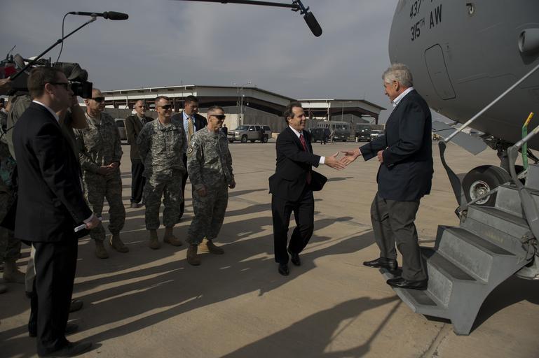 | Keywords: SecDef visits Iraq 141209-D-DT527-015.jpg en Stuart Jones ambassador to Iraq welcomes Secretary of Defense Chuck Hagel as he arrives at the Baghdad International Airport Iraq during a visit Dec 9 2014 Photo by Master Sgt Adrian Cadiz/eleased 2014-12-09 Master Sgt Adrian Cadiz https //www dvidshub net/image/1692559 141209-D-DT527-015 2014-12-09 16 05 BAGHDAD IQ PD-USGov Chuck Hagel Images from DoD uploaded by Fæ | ||||