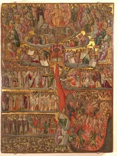 | Keywords: Second Coming by G.Klontzas (16th c.).jpg  Η Δευτέρα Παρουσία τέλη 16ου αιώνα 96x127εκ Γεώργιος Κλόντζας ΧΟΡΟC ΠΑΤΡΙΑΡΧΩ ΚΑΙ ΒΑCΙΛΕΩ ΧΟΡΟC ΙΕΡΕΩ ΑΡΧΙΕΡΕΩ ΚΑΙ ΠΑΤΡΙΑΡΧΩ ΧΟΡΟC ΑΓΙΩ ΓΥ ΑΙΚΩ ΚΑΙ ΒΑCΙΛΕΩ ΧΟΡΟC ΟCΙΩ ΑCΚΗΤΩ ΚΑΙ  ΑΡΤΥΡΩ Γύρω α ό τον κατακόρυφο άξονα  ου δημιουργείται α ό τον  ύρινο  οταμό ο ο οίος καταλήγει στην Κόλαση οργανώνεται αυτή η  αράσταση της Δευτέρας Παρουσίας ένα α ό τα σημαντικότερα έργα του Κλόντζα Ε άνω και στο μέσο  αριστάνεται ο Ιησούς Κριτής  λαισιωμένος α ό τον Ιωάννη τον Πρόδρομο και την Παναγία τους α οστόλους και  λήθος αγγέλων Στα  όδια του βρίσκονται τα σύμβολα των ευαγγελιστών και νεκροί  ου αναμένουν την ώρα της Κρίσης Πιο κάτω  αριστάνονται η Ετοιμασία του θρόνου οι δίκαιοι σε τρεις διαδοχικές σειρές και στο κάτω μέρος η έγερση των νεκρών με τους σκελετούς  ου αναδύονται α ό τους τάφους Δεξιά βρίσκεται ο αρχάγγελος  ιχαήλ  ου υψώνει το σ αθί α ειλώντας μία ομάδα ανθρώ ων και το υ όλοι ο τμήμα καταλαμβάνεται α ό την Κόλαση με την κάμινο του  υρός το αναγεννησιακό οικοδόμημα με τον τρούλλο Τέλος κάτω στο μέσον της εικόνας εικονίζονται οι  ροφήτες Δαβίδ και Ιεζεκιήλ με  λάκες στις ο οίες υ άρχουν ε ιγραφές  ου αναφέρονται στην Κόλαση http //eib xanthi ilsp gr/gr/icons asp late 16th century Creator Georgios Klontzas Georgios Klontzas Files uploaded by Shakko from various sources Icons of Last Judgment PD-old |