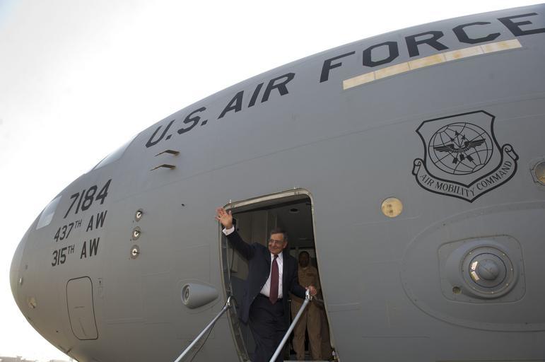 Keywords: Secretary of Defense Panetta's 5-day trip 120731-D-BW835-463.jpg en U S Secretary of Defense Leon E Panetta waves before departing from Cairo aboard a U S Air Force C-17 Globemaster III aircraft July 31 2012 He was on a five-day trip to the region to meet with counterparts in Tunisia Egypt Israel and Jordan 2012-07-31 DoD photo by Erin A Kirk-Cuomo https //www dvidshub net/image/637985 120731-D-BW835-463 2012-08-02 12 23 CAIRO EG PD-USGov Leon Panetta Boeing C-17 Globemaster III Images from DoD uploaded by Fæ |