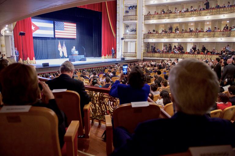 | Keywords: U.S. Secretary of State John Kerry, sitting in an audience that included Cuban President Raul Castro and Cuban Foreign Minister Bruno Rodriguez Parilla, watches President Obama on March 22, 2016, at the Gran Teatro in Havana, Cuba, as he delivers an address to the Cuban people and their leaders. [State Department photo/ Public Domain] secretarykerryhavanacubapresidentobamaembassygranteatropresidentobama secretarykerryhavanacubapresidentobamaembassygranteatro | ||||