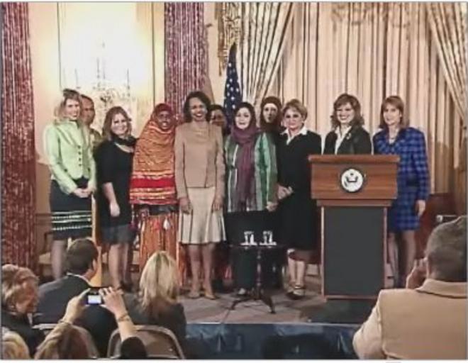 | Keywords: Secretary Rice announces recipients of the 2nd annual International Women of Courage awards, in the Benjamin Franklin Room of the State Department 2008.jpg en Secretary Rice announces recipients of the 2nd annual International Women of Courage awards in the Benjamin Franklin Room of the State Department 2008 l-r Andrea Bottner senior coordinator Office of International Women's Issues; Virisila Buadromo of Fiji; Valdete Idrizi of Kosovo; Farhiyo Farah Ibrahim of Somalia; Secretary of State Condoleezza Rice; Dr Begum Jan of Pakistan behind Secretary Rice ; Suraya Pakzad of Afghanistan; Nibal Thawabteh of Palestine behind Pakzad ; Cynthia Bendlin of Paraguay; and Dr Eaman Al-Gobory of Iraq The individual in blue on the far right is an unidentified staff member 2008-03-10 http //unesco usmission gov/news20080311 html U S Government State Department other versions PD-USGov Uploaded with UploadWizard 2008 International Women of Courage Award |