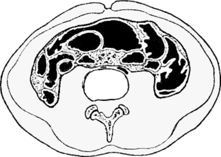 Keywords: Section through umbilicus least pressure the black spaces indicate the empty intestines.gif An Illustration from The Corset Published in New York Medical Journal November 5 1887 1887-11-05 Robert L Dickinson Copyright has expired due to the age of the publication PD-old Results of corset use |