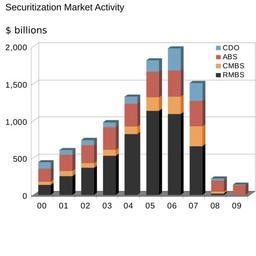 Keywords: Securitization Market Activity.svg Financial Crisis Inquiry Commission The securitization markets also remain impaired as investors anticipate more loan losses Investors are also uncertain about coming legal and accounting rule changes and regulatory reforms Private bond issuance of residential and commercial mortgage-backed securities asset-backed securities and CDOs peaked in 2006 at close to 2 trillion In 2009 private issuance was less than 150 billion and almost all of it was asset-backed issuance supported by the Federal Reserve's TALF program to aid credit card auto and small-business lenders Issuance of residential and commercial mortgage-backed securities and CDOs remains dormant <ref>http //www fcic gov/hearings/pdfs/2010-0113-Zandi pdf Testimony of Mark Zandi to Financial Crisis Inquiry Commission-January 2010</ref> Banks and other financial institutions packaged various types of loans including mortgages into securities and sold them to global investors This is called securitization In exchange for purchasing the investment the investor receives a right to the cash flows from the underlying loans specified for the security The chart shows how this financing source dried-up meaning that non-prime mortgages and other types of loans could not be originated and sold to investors Reflist 2012-03-15 http //www economy com/mark-zandi/documents/FCIC-Zandi-011310 pdf Financial Crisis Inquiry Commission PD-USGov Uploaded with UploadWizard Mortgage crisis 2000s Banking Economy of the United States |