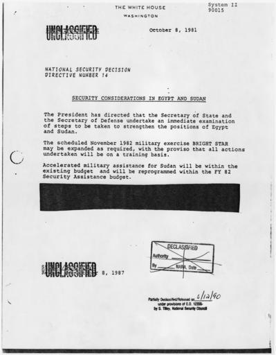 | Keywords: Security Considerations in Egypt and Sudan - NARA - 198178.jpg Scope and content General notes 198178 Local identifier President 1981-1989 Reagan National Security Council 1981 - 1989 Ronald Reagan Library NLRR 40 Presidential Drive Simi Valley CA 93065-0600 1981-10-08 Record group Collection RR-NSC Numbered National Security Policy Papers 1981 - 1989 Record group ARC 1189 National Security Decision Directives compiled 02/25/1981 - 01/19/1989 Series ARC 198166 File unit File unit ARC Variant control numbers NAIL Control Number NLS-NSC-NSDD-14 Other versions <gallery> File Security_Considerations_in_Egypt_and_Sudan_-_NARA_-_198178 tif tif File Security_Considerations_in_Egypt_and_Sudan_-_NARA_-_198178 jpg jpg </gallery> NARA-cooperation PD-USGov Presidential Decision Directives Reagan Bright Star |
