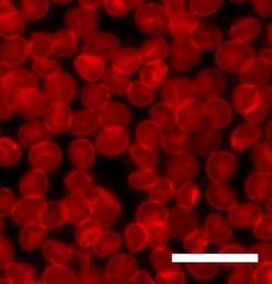 Keywords: Sedimented red blood cells.jpg en Human red blood cells erythrocytes supported on a glass slide The cell membrane is stained with the lipid bilayer dye octadecyl rhodamine Scale bar is 20 microns Own MDougM 2009-02-11 Microscopic images Red blood cells |