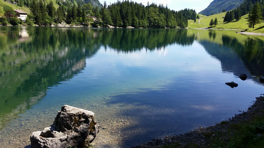 Keywords: seealpsee switzerland swiss alps water mirroring appenzell nature forests trees green summer landscape sunny