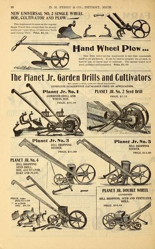 Keywords: Seed annual (16264117280).jpg D M FERRY CO DETROIT MICH <br> NEW UNIVERSAL NO 2 SINGLE WHEEL <br> HOE CULTIVATOR AND PLOW <br> This implement is same as the regular <br> Single Wheel Hoe except that the attach- <br> ments are 1 pair Hoes 3 Cultivator Teet <br> and 1 Large Plow Price 4 35 <br> Hand fVheel Plow <br> This little labor-saving implement is one that commends <br> itself to all gardeners It can be used to prepare the ground to <br> furrow out to cover and to cultivate The mould board is of <br> steel polished and tempered Price 3 25 <br> Tbe Planet Jr Garden Drills and Cultivators <br> Planet Jr No 1 <br> COMBINED DRILL AND <br> WHEEL HOE <br> PRICE 10 50 <br> WE CARRY A FULL LINE OP THESE MACHINES <br> COMPLETE DESCRIPTIVE CATALOGUE FREE ON APPLICATION <br> PLANET JR No 2 Seed Drill <br> PRICE 7 75 <br> Planet Jr No 3 <br> HILL DROPPING <br> SEEDER <br> PRICE 11 00 <br> Planet Jr No 3 <br> HILL DROPPING <br> SEEDER <br> PRICE 14 00 <br> PLANET JR DOIBLE WHEEL <br> COMBINED <br> HILL DROPPING SEED AND FERTILIZER <br> DRILL <br> PRICE 19 00 43827987 149307 77819 Page 98 Text http //www biodiversitylibrary org/page/43827987 1921 10 5962/bhl title 77819 D M Ferry Co ; Henry G Gilbert Nursery and Seed Trade Catalog Collection Biodiversity Heritage Library Seed annual Garden Stories Detroit Equipment and supplies Flowers Gardening Michigan Nursery stock Seed industry and trade Seeds Vegetables U S Department of Agriculture National Agricultural Library bhl page 43827987 dc identifier http //biodiversitylibrary org/page/43827987 DM Ferry Co bhlGardenStories Garden Drills BHLinbloom u s department of agriculture national agricultural library dm ferry co bhlgardenstories garden drills bhlinbloom Information field Flickr posted date ISOdate 2015-02-05 CC-BY-2 0 BioDivLibrary https //flickr com/photos/61021753 N02/16264117280 2015-08-24 04 55 59 cc-by-2 0 PD-old-70-1923 1900 D M Ferry seed catalog Photos uploaded from Flickr by Fæ using a script Ploughs |