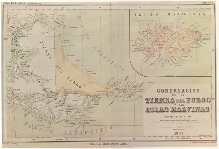 | Keywords: Seelstrang1886.jpg In 1882 the Argentine Geographic Institut decided to issue a general map and a atlas of the Argentine Republic The task was put in the hands of the well known Profesor of the University of Cordoba Arturo Seelstrang who had already brought out a map of the Republic in 1875 The Atlas was 'constructed and published' by the institute 'under the auspices of the National Government' Plate XXVII of the Atlas reproduced here was headed 'Governoship of Tierra del Fuego and the Malvinas Islands' and were drawn up in 1885 and published the following year As may be observed said map shows the boundary line running through the centre of the Beagle Channel indicating Picton Nueva and Lennox Islands an all the other islands and islets extending southwards as far as Cape Horn as being under Chilean sovereignty El Conflicto del Beagle edited by the chilean Foreign Affairs Office 1978 Switzerland 2007-08-19 Arturo Seelstrang PD-old Old maps of Patagonia Maps related to the Beagle conflict |
