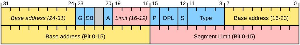 | Keywords: SegmentDescriptor.svg Segment descriptor format for a protected mode segment descriptor on 286-compatible CPUs The italic fields are added in the 32-bit protected mode of the 80386 processor<br /> S System segment 0 System 1 code or data DPL Descriptor privilege level P Segment present A Freely available for use by system software DB Default operand size 0 16 bit 1 32 bit G Granularity of segment limit 0 segment limit counts bytes 1 segment limit counts 4-KiB units Type Describes what type a segment is Such as if it is a code segment or not OR whether it is operating under read write or execute privileges etc selfmade work 2007-01-24 Lars H Rohwedder User RokerHRO selfmade work Intel microprocessors Operating systems |