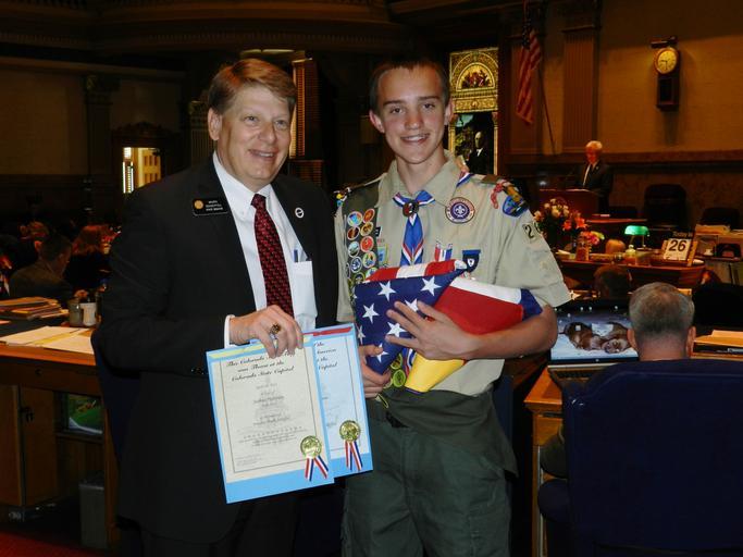 Keywords: indoor Assistant Minority Leader Mark Scheffel presents flags to Boy Scouts from his district. Assistant Minority Leader Mark Scheffel presents flags to Boy Scouts from his district.