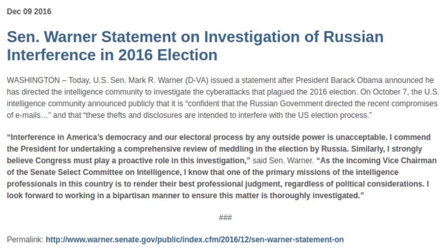 | Keywords: Senator Warner Statement on Investigation of Russian Interference in 2016 Election.png en Dec 09 2016 Sen Warner Statement on Investigation of Russian Interference in 2016 Election WASHINGTON “ Today U S Sen Mark R Warner D-VA issued a statement after President Barack Obama announced he has directed the intelligence community to investigate the cyberattacks that plagued the 2016 election On October 7 the U S intelligence community announced publicly that it is confident that the Russian Government directed the recent compromises of e-mails ¦ and that these thefts and disclosures are intended to interfere with the US election process Interference in America ™s democracy and our electoral process by any outside power is unacceptable I commend the President for undertaking a comprehensive review of meddling in the election by Russia Similarly I strongly believe Congress must play a proactive role in this investigation said Sen Warner As the incoming Vice Chairman of the Senate Select Committee on Intelligence I know that one of the primary missions of the intelligence professionals in this country is to render their best professional judgment regardless of political considerations I look forward to working in a bipartisan manner to ensure this matter is thoroughly investigated Permalink http //www warner senate gov/public/index cfm/2016/12/sen-warner-statement-on 2016-12-09 http //www warner senate gov/public/index cfm/2016/12/sen-warner-statement-on warner senate gov U S Sen Mark R Warner D-VA other versions PD-USGov Mark Warner Russian interference in 2016 United States elections |